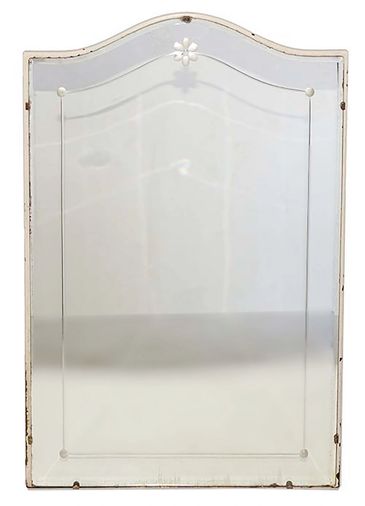 Vintage wooden medicine cabinet, painted white. Right-hinged door has mirror, ornmanetal hinge plates.